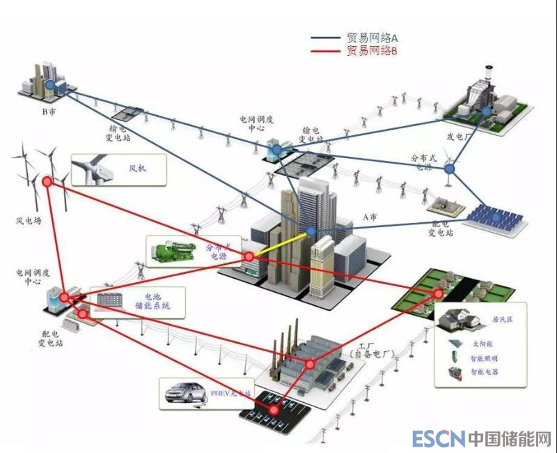 節(jié)點電價所采用的物理潮流模型屬于圖2中第1層(電力系統(tǒng)層)的網(wǎng)絡(luò)模型,但電能商品的交易(貿(mào)易)關(guān)系包括比物理電網(wǎng)更多的社會和經(jīng)濟屬性,為體現(xiàn)這種復(fù)雜的交易(貿(mào)易)關(guān)系,本文引入“貿(mào)易網(wǎng)絡(luò)”的概念,一個相關(guān)的概念是運營管理(Operations Management)課程中所講的“供應(yīng)鏈網(wǎng)絡(luò)”(Supply chain network,https://en.wikipedia.org/wiki/Supply_chain_network)。供應(yīng)鏈網(wǎng)絡(luò)是基本供應(yīng)鏈(supply chain)的發(fā)展。由于技術(shù)的快速進(jìn)步,具有基本供應(yīng)鏈的商業(yè)組織可以將這個鏈發(fā)展成更復(fù)雜的結(jié)構(gòu),涉及更多商業(yè)組織之間的更高層面的相互依賴性和連接性,因而形成供應(yīng)鏈網(wǎng)絡(luò)。在電力市場中,貿(mào)易網(wǎng)絡(luò)或供應(yīng)鏈網(wǎng)絡(luò)是一種由發(fā)、用電權(quán)交易而組成的抽象的網(wǎng)絡(luò),與物理電網(wǎng)是兩回事。電能商品貿(mào)易網(wǎng)絡(luò)與物理電網(wǎng)的關(guān)系可用圖3來表示。圖3中,在同一個物理電網(wǎng)的基礎(chǔ)上,形成了2個貿(mào)易網(wǎng)絡(luò),藍(lán)色的貿(mào)易網(wǎng)絡(luò)A由主力化石能源發(fā)電廠、A市的主要商業(yè)負(fù)荷、B市負(fù)荷和少量可再生能源的電能交易而形成,采用統(tǒng)一電能價格(不含輸配電價)。而紅色的貿(mào)易網(wǎng)絡(luò)B由工廠及其自備電廠、風(fēng)電場、居民用戶及屋頂太陽能、A市分布式電源及次要商業(yè)負(fù)荷、電池儲能系統(tǒng)及PHEV充電站的電能交易形成,采用統(tǒng)一電能價格(不含輸配電價)。2個貿(mào)易網(wǎng)絡(luò)在A市相連。顯然2個貿(mào)易網(wǎng)絡(luò)與物理電網(wǎng)的拓?fù)浣Y(jié)構(gòu)不同,也不服從物理潮流定律,實際上,貿(mào)易網(wǎng)絡(luò)屬于圖2中第2層(商品交易層)的網(wǎng)絡(luò)模型。