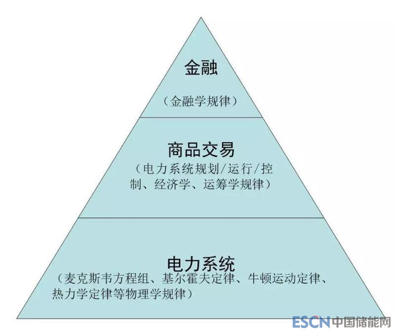 與其他市場顯著不同,電力市場是基于電力系統(tǒng)這個物理網(wǎng)絡(luò)而建立的,電力(功率)實時平衡是電力系統(tǒng)穩(wěn)定運行的基本條件,需要比較復(fù)雜的調(diào)度過程。總體來說,電力市場/電力系統(tǒng)的問題可分為電力系統(tǒng)物理層、商品交易層和金融交易層3個層次,各自服從不同的規(guī)律,但又互相關(guān)聯(lián)。在3個不同層次中,“電能”的內(nèi)涵是完全不同的,如圖2所示。