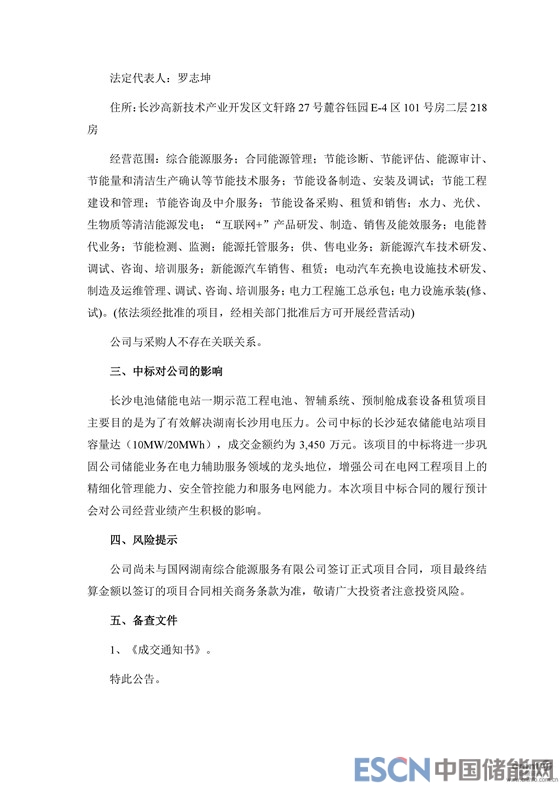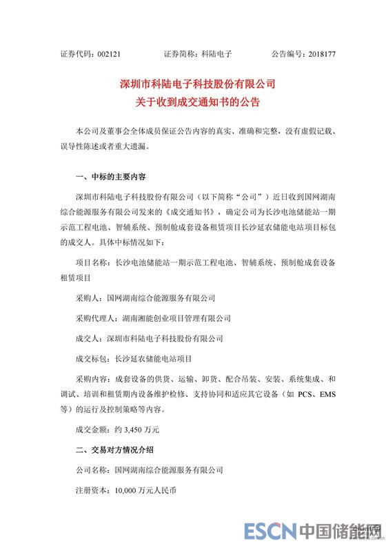 中國儲能網(wǎng)訊:10月8日晚間,科陸電子發(fā)布公告稱,公司近日收到國網(wǎng)湖南綜合能源服務有限公司發(fā)來的《成交通知書》,確定公司為長沙電池儲能站一期示范工程電池、智輔系統(tǒng)、預制艙成套設備租賃項目長沙延農(nóng)儲能電站項目標包的成交人,成交金額約3,450萬元。