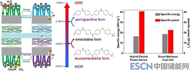 目前,大多數(shù)化學(xué)電源難以同時(shí)兼具高功率密度與高能量密度:燃料電池能量密度高,但由于液體燃料電氧化與氧電還原反應(yīng)動(dòng)力學(xué)過(guò)程慢,導(dǎo)致其功率密度較低;而超級(jí)電容器功率密度較高,但受限于電極活性材料比容量,其能量密度較低。本工作中,付旭東、夏章訊等創(chuàng)新性地設(shè)計(jì)并構(gòu)筑了一種基于贗電容材料聚苯胺和電催化材料Pt/C(陰極)或PtRu/C(陽(yáng)極)的新型雙效電極,借此構(gòu)建了原位直接甲醇燃料電池與超級(jí)電容器復(fù)合電源。該復(fù)合電源借助聚苯胺在陰極(氧電還原反應(yīng))與陽(yáng)極(甲醇電氧化反應(yīng))電位區(qū)間可發(fā)生氧化/還原態(tài)轉(zhuǎn)變的特性,實(shí)現(xiàn)了超級(jí)電容器原位自充電。得益于聚苯胺快速的贗電容放電特性,復(fù)合電源的脈沖放電性能大幅提升,單體電池功率密度可達(dá)4kW/kg,較傳統(tǒng)直接甲醇燃料電池提高了80%以上。同時(shí),甲醇的持續(xù)供給保障了復(fù)合電源的高能量密度。該工作闡釋的贗電容與電化學(xué)反應(yīng)耦合機(jī)制為下一代高比特性化學(xué)電源提供了新的研究思路。