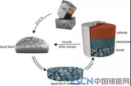 最近,為了更加安全經(jīng)濟(jì)地使用這種活潑液態(tài)金屬負(fù)極,Goodenough 老先生又開發(fā)了一種室溫Na/K合金負(fù)極膜---將合金液體滲透進(jìn)多孔金屬集流體薄膜[9]。這種創(chuàng)造性的設(shè)計(jì)減小了液態(tài)合金負(fù)極表面強(qiáng)勁的表面張力,提高了與液態(tài)電解質(zhì)之間的浸潤性,減小了電極/電解質(zhì)界面阻抗。此外,他們還探究了液態(tài)合金與不同電解液的相容性。碳酸酯電解液與合金負(fù)極不互溶,界面穩(wěn)定能夠抑制枝晶生長又不會造成電池內(nèi)短路;而醚類電解液會微量溶解合金負(fù)極,不適合全電池的裝配。