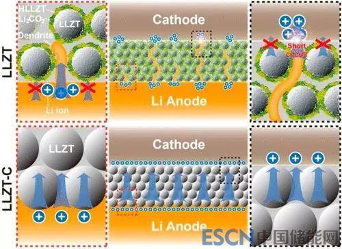 Goodenough 先生及其團(tuán)隊(duì)通過對LLZTO陶瓷電解質(zhì)進(jìn)行高溫碳處理(LLZTO-C)成功地解決了其界面兼容性不佳的難題[4]。