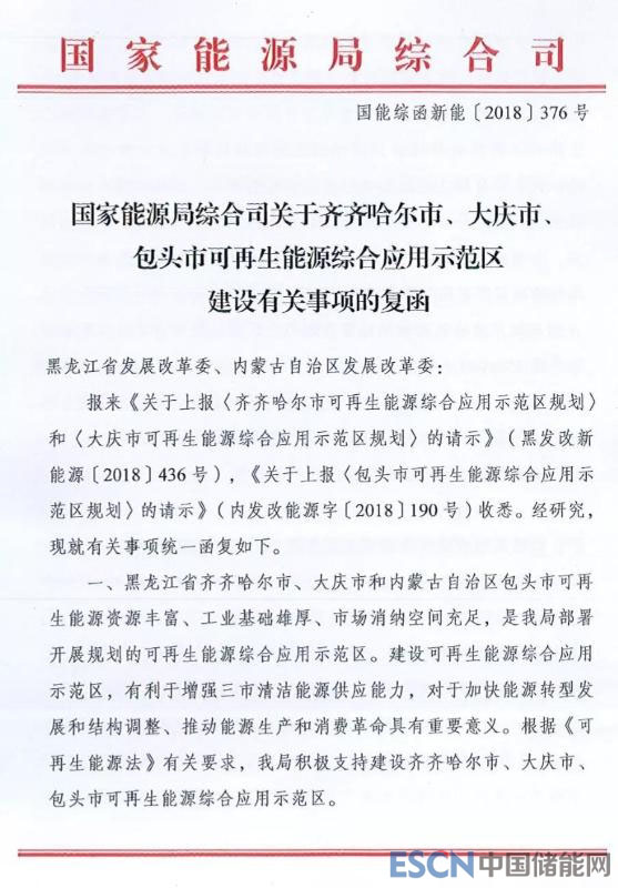 中國(guó)儲(chǔ)能網(wǎng)訊:日前,國(guó)家能源局綜合司對(duì)黑龍江齊齊哈爾市、大慶市,內(nèi)蒙古包頭市上報(bào)的關(guān)于可再生能源綜合應(yīng)用示范區(qū)規(guī)劃的請(qǐng)示統(tǒng)一復(fù)函,指出積極支持建設(shè)齊齊哈爾市、大慶市、包頭市可再生能源綜合應(yīng)用示范區(qū)。