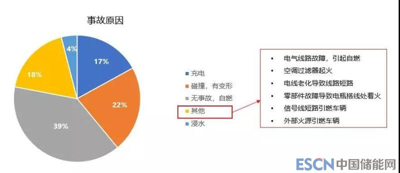 事故的原因主要有充電起火,占到17%;碰撞起火,占到22%;無事故自燃,占到39%,這部分主要是指從電池部位先開始起火的事故;其他原因占到18%,主要包括電氣線路故障、電線老化、零部件故障等原因引發(fā)的起火,不是電池本身的原因;最后還有浸水起火,占到4%。