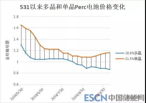 5.31之后Perc電池價格(圖中黃色曲線)進入了更加陡峭的快速下滑趨勢中,然后整個7~8月間,高效率的perc電池片與常規(guī)多晶的價格差維持在0.15~0.19的區(qū)間內(nèi)。再考慮更高功率的Perc電池在封裝環(huán)節(jié)每瓦可有7分錢的優(yōu)勢,使得彼時Perc電池片具備十分突出的性價比,進而促使下游需求紛紛轉(zhuǎn)向,這也是Perc電池片與多晶電池片最近價格差重新拉大的重要原因。