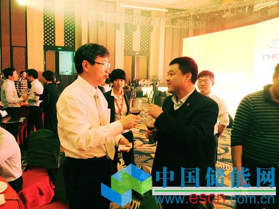 圖為奇瑞公司董事長尹同躍(左)與天能集團(tuán)副總裁周建中(右)在年會上親切交談
