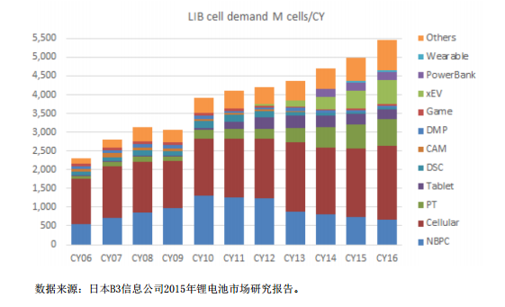 此外,日本B3信息咨詢公司2015年發(fā)布的鋰電市場(chǎng)分析報(bào)告顯示,以鋰電池電芯數(shù)量出貨量計(jì)算,2015年全球鋰電同比增長(zhǎng)約11.02%,考慮到單顆電芯的容量穩(wěn)定上升及動(dòng)力鋰電的迅速發(fā)展,過(guò)去十年,鋰電正極材料行業(yè)保持了24%的復(fù)合增長(zhǎng)率,2015年鋰電正極材料出貨量達(dá)到15.4萬(wàn)噸。鋰電池在智能手機(jī)、電動(dòng)工具、電動(dòng)汽車(chē)等應(yīng)用領(lǐng)域發(fā)展樂(lè)觀。2006年~2016年鋰電池應(yīng)用領(lǐng)域發(fā)展趨勢(shì)見(jiàn)下圖: