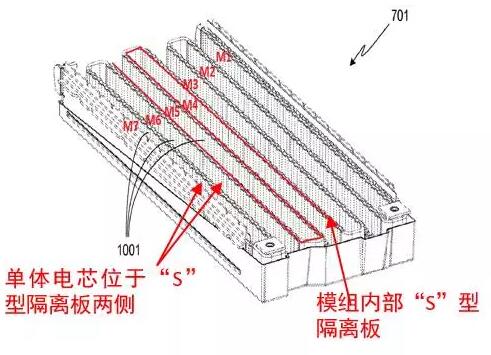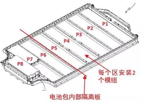電池包內(nèi)8個(gè)區(qū)域(包括突出部分)相互之間是完全隔絕的,一是通過(guò)隔離板增加了電池包整體的結(jié)構(gòu)強(qiáng)度,使整個(gè)電池包結(jié)構(gòu)更加堅(jiān)挺;二是當(dāng)某個(gè)區(qū)域的電池起火時(shí)能有效阻隔,避免引燃其他區(qū)域的電池。隔離板內(nèi)部可以被填充高熔點(diǎn)、低熱導(dǎo)的材料(例如玻璃纖維)或水。