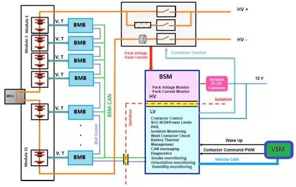 2)在電池包的層面上,設(shè)置有BSM (BatterySystem Monitor), 監(jiān)控整個(gè)電池包的運(yùn)行狀態(tài),包括電池包的電流,電壓,溫度,濕度,方位,煙霧等;