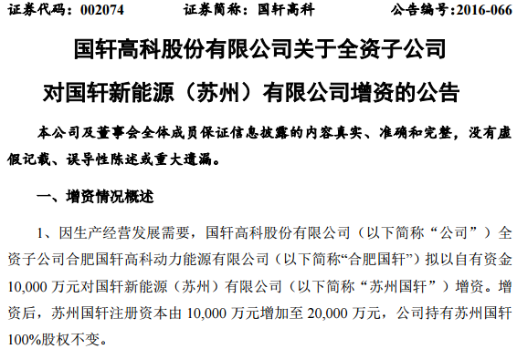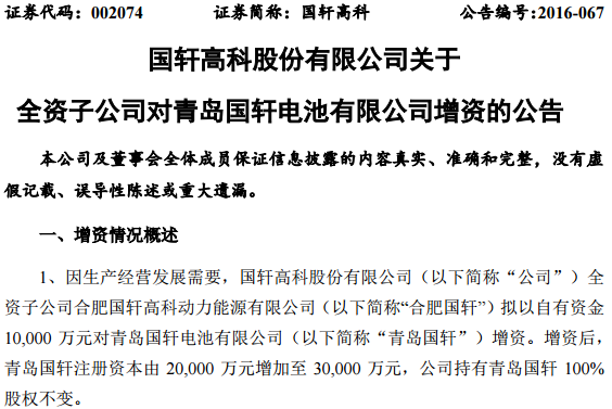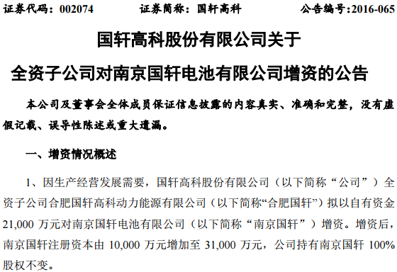 同時(shí),國軒高科還公告,子公司合肥國軒擬以自有資金增資青島國軒電池有限公司(以下簡稱“青島國軒”)、南京國軒電池有限公司(以下簡稱“南京國軒”)、國軒新能源(蘇州)有限公司(以下簡稱“蘇州國軒”)各1億元:合肥國軒擬以自有資金10,000萬元對青島國軒增資。增資后,青島國軒注冊資本由20,000萬元增加至30,000萬元,公司持有青島國軒100%股權(quán)不變;合肥國軒擬以自有資金21,000萬元對南京國軒增資。增資后,南京國軒注冊資本由10,000萬元增加至31,000萬元,公司持有南京國軒100%股權(quán)不變;合肥國軒擬以自有資金10,000萬元對蘇州國軒增資。增資后,蘇州國軒注冊資本由10,000萬元增加至20,000萬元,公司持有蘇州國軒100%股權(quán)不變。