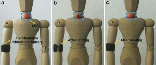 開發(fā)這項技術(shù)的研究團(tuán)隊,利用佩戴在玩偶手臂上的柔性腕帶形狀電池進(jìn)行了演示。電池受到損傷后,會自己“長好”,恢復(fù)供電,就像沒有受到過損傷一樣。