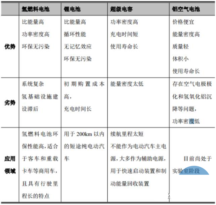 目前在交通運輸用動力源方面,主要有四種技術路線:鋰離子電池、氫燃料電池、超級電容和鋁空氣電池。其中鋰離子電池、超級電容和氫燃料電池得到廣泛的應用,而鋁空氣電池尚處于實驗室研究階段。能源補給方面,鋰離子電池、超級電容適用于純電動汽車,但是需要外部充電,而氫燃料電池汽車則需要外部氫氣加注,鋁空氣電池則需要補充鋁板和電解液。就目前來看,鋰離子電池在未來相當長的一段時間內(nèi)還是要占據(jù)主要發(fā)展空間的。