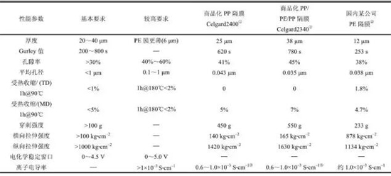 鋰電隔膜性能要求及幾種商品膜性能參數(shù)