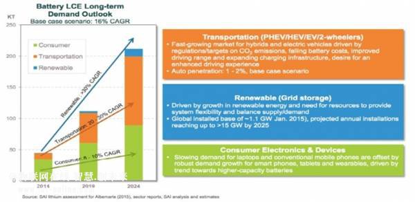 發(fā)展中國家--如中國、印度等國家智能手機市場的持續(xù)擴大,將能夠保證全球?qū)︿嚮蚱渌姵夭牧弦恢庇休^高的需求量;不過筆記本電腦和舊式便攜設備的銷量下滑也意味著,這一細分市場的需求可能并不會如預期那樣增長;高新科技市場--如可穿戴設備和智能手表的發(fā)展也將有助于鋰電池需求的增長;不過汽車和可再生能源這一新興市場預計將在未來十年才能進一步擴大。