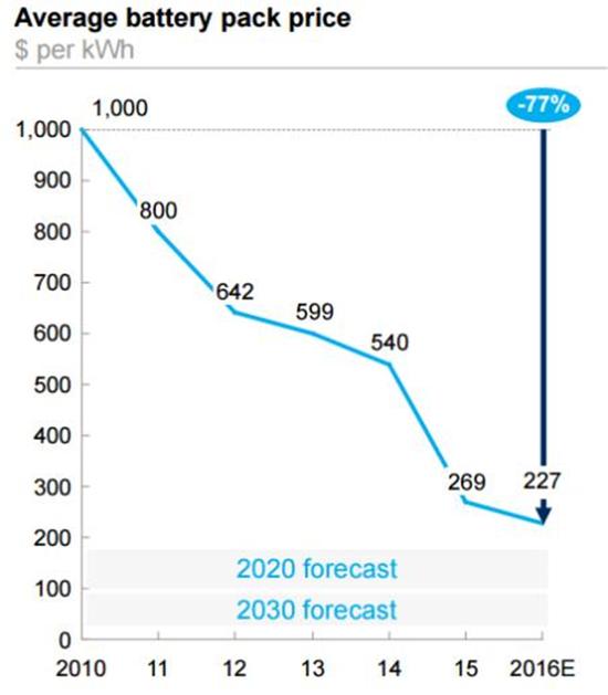 根據(jù)Mckinsey&Company(麥肯錫)的一份研究顯示:電池包的平均價格從2010年到2016年下降了高達77%,2016年平均價格大概在227美元/kWh左右,2030年平均價格將低于100美元/kWh(圖1)。而特斯拉宣稱其電池包價格在2016年上半年已經(jīng)小于190美元/kWh,低于Mckinsey & Company的227美元/kWh平均值。而特斯拉超級工廠的開業(yè)在2016年中旬,如此看來,貌似在超級工廠發(fā)揮作用之前,特斯拉的電池價格也已經(jīng)下降了很多。到底超級工廠還能為特斯拉后面的電池價格下降帶來多大的推動作用,還要拭目以待。
