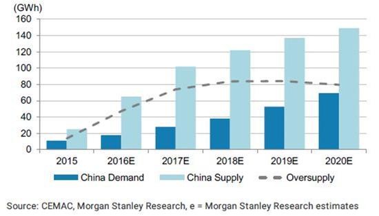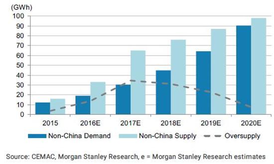摩根斯坦利研究報告認為:給特斯拉超級工廠帶來潛在風險的主要是來自中國電池市場的挑戰(zhàn)。中國電動汽車市場的快速升溫使得中國本土電池制造商的電池價格在過去幾年下降了很多,并且這種下降趨勢還會繼續(xù)持續(xù)下去。此外,全球電池市場需求量已經(jīng)呈現(xiàn)供過于求的局面,尤其以中國市場最為顯著(圖2)。一方面這將驅使電池價格的進一步下降,另一方面,中國本土市場過剩的電池也會逐漸向外擴散銷往其他國家市場(圖3)。2017年動力電池的合同價格將可能達到150美元/kWh,而非工業(yè)界通常預期的200美元/kWh。因此,中國電池市場的發(fā)展狀況,將直接影響特斯拉超級工廠的前途。