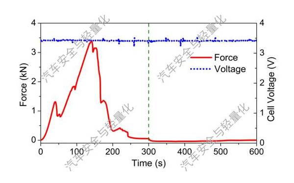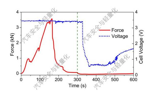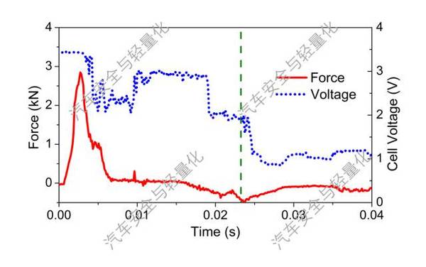 實(shí)驗(yàn)1中,采用金屬?zèng)_頭進(jìn)行加載,加載速度5mm/min, 軟包電池在穿刺過(guò)程中并未發(fā)生明顯的短路現(xiàn)象,直到?jīng)_頭開始反向運(yùn)動(dòng)時(shí)才發(fā)生了電壓的陡降。而在沖頭從電池中完全退出之后,電池電壓有一定程度的恢復(fù)。實(shí)驗(yàn)2中,同樣的速度采用塑料沖頭進(jìn)行加載,整個(gè)實(shí)驗(yàn)過(guò)程中電池都未出現(xiàn)短路現(xiàn)象。由實(shí)驗(yàn)結(jié)可以推知,在穿刺工況下,電池內(nèi)短路的發(fā)生主要是金屬侵入物和電極間的接觸導(dǎo)致。實(shí)驗(yàn)3中,依然采用金屬?zèng)_頭,加載速度提高到4.5m/s。在沖頭穿透電池的瞬間,電池即出現(xiàn)了明顯的短路(電壓和載荷在同一時(shí)刻出現(xiàn)陡降)。實(shí)驗(yàn)結(jié)果表明,在高速載荷下,軟包電池發(fā)生短路失效的風(fēng)險(xiǎn)大大增加。