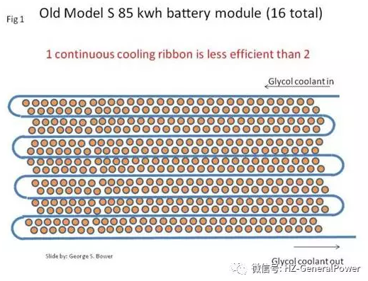 目前來看,P100D之所以能夠“擠進(jìn)”更多的電芯,很大一部分是得益于冷卻系統(tǒng)的重新設(shè)計(jì)。冷卻系統(tǒng)的重新設(shè)計(jì)要保證兩個(gè)基本點(diǎn):(1)騰出更多的空間;(3)保證冷卻效果。P100D的冷卻系統(tǒng)如下圖: