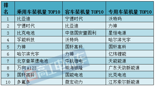 分領(lǐng)域看,在乘用車、客車和專用車領(lǐng)域裝機(jī)量居于首位的動(dòng)力電池企業(yè)分別為比亞迪、寧德時(shí)代與沃特瑪。此外,力神、星恒電源、中信國(guó)安盟固利、哈爾濱光宇、億緯鋰能、中航鋰電、國(guó)能電池、微宏動(dòng)力、廣東天勁、孚能科技、珠海銀隆、江蘇索爾、均等知名電池企業(yè)均憑借良好的成績(jī)出現(xiàn)在前十位的排名榜中。
