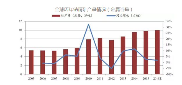 2016年全球鈷原料產(chǎn)量折合成金屬量約為10.1萬噸,同比增加3.5%。受銅鎳礦價格多年低迷的影響,鈷礦勘探及開發(fā)新增投入有限,再疊加鈷礦較為集中,剛果(金)占據(jù)資源的一半以上,政局動蕩以及童工手抓礦人權(quán)問題,導(dǎo)致2016年剛果產(chǎn)量下滑約10%,拖累全球鈷供給增長放緩。