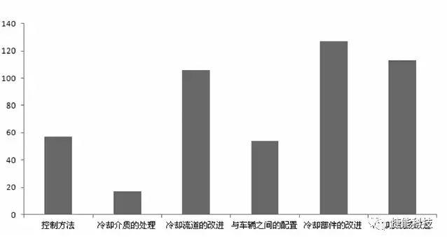 電池散熱研究主要集中在冷卻部件的改進(jìn)、冷卻系統(tǒng)的設(shè)計(jì)、冷卻流道的設(shè)計(jì)上,其次是冷卻控制方法和冷卻裝置與車輛之間的配置,有少部分專利涉及到對(duì)冷卻介質(zhì)的處理。