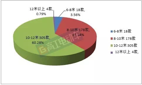 本批公告中,6-8米客車車型數(shù)量為18款,占比達(dá)到3.56%;8-10米車型共計(jì)178款,占比達(dá)到35.18%;10-12米的車型數(shù)量高達(dá)305款,占比達(dá)到60.28%;12米以上的車型有4款,其中有2款車長達(dá)到18米左右。分別由珠海廣通與浙江南車電車推出。