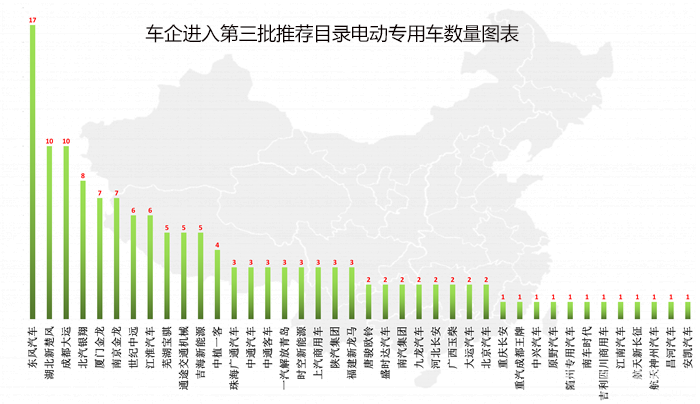 在第三批推薦目錄中,有40家電動專用車生產(chǎn)企業(yè)進入,它們的電動專用車進入情況如下: