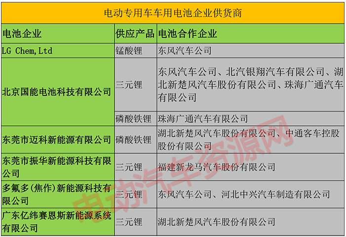 在142款車型中,有32家動力電池企業(yè)與該目錄的車型有配套。其中,有26家電池企業(yè)提供三元鋰電池,有7家電池企業(yè)供給磷酸鐵鋰電池,只有2家電池企業(yè)供給錳酸鋰電池。值得一提的是在這些企業(yè)中,LG化學與東風汽車有合作。以下是各動力電池企業(yè)供貨以及與車企合作情況: