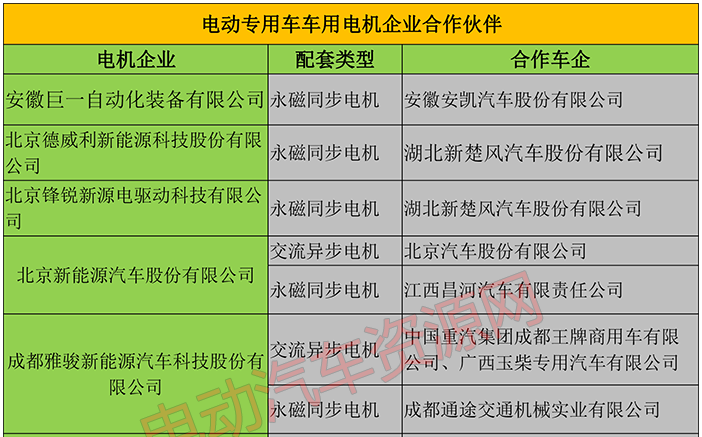 在第三批推薦目錄142款電動專用車中,49家電機企業(yè)與該目錄車型配套,其中42家企業(yè)提供永磁同步電機,10家企業(yè)提供交流異步電機。以下是電機企業(yè)與車企合作情況: