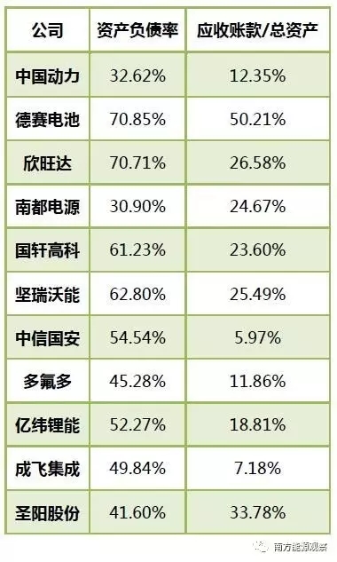 資金風(fēng)險(xiǎn)方面,從資產(chǎn)負(fù)債率看,目前11家上市公司資金情況總體良好,但德賽電池和欣旺達(dá)負(fù)債率偏高,超過了70%。另有企業(yè)在年報(bào)中提及應(yīng)收賬款回收風(fēng)險(xiǎn),11家公司應(yīng)收賬款占總資產(chǎn)的比例平均值超過20%,德賽電池這一數(shù)值超過50%。