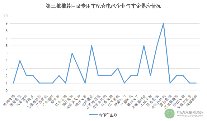 從第三批推薦目錄中車企選擇合作的電池企業(yè)看,在三元電池上,選擇與上海德朗能、比克電池與億緯鋰能合作的企業(yè)最多;選配磷酸鐵鋰的車企多選擇與沃特瑪合作;錳酸鐵鋰只有星恒一家,也只有一家車企選擇與之合作。