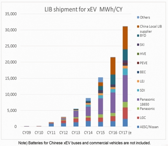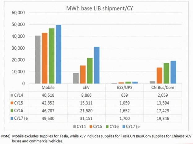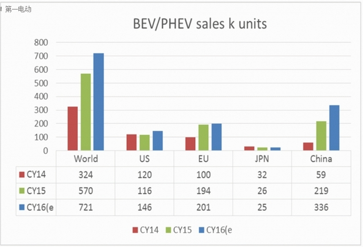 根據(jù)B3公司高級(jí)副總裁Takeshi Miyamoto的報(bào)告, 全球各國環(huán)境保護(hù)政策和電動(dòng)車刺激政策(例如,美國的ZEV法規(guī),歐洲的CO2排放法規(guī),中國的NEV法規(guī)等)將繼續(xù)成為推動(dòng)電動(dòng)車銷量增長和對(duì)鋰離子動(dòng)力電池需求量上升的主要因素。其中,包括消費(fèi)類電池和汽車動(dòng)力電池在內(nèi)的需求量在2017年將達(dá)到100GWh,其中消費(fèi)類電池的需求大約為50GWh,乘用車需求約31GWh,另外19GWh的需求主要來自中國的大巴車等商用車(圖1)。2016年,全球BEV/PHEV乘用車的銷量約為721,000輛,其中美國占146,000輛,歐洲占據(jù)201,000輛,日本為25,000輛,中國為336,000。其中美國和歐洲的銷量增長很小,而中國引領(lǐng)了市場的顯著增長。