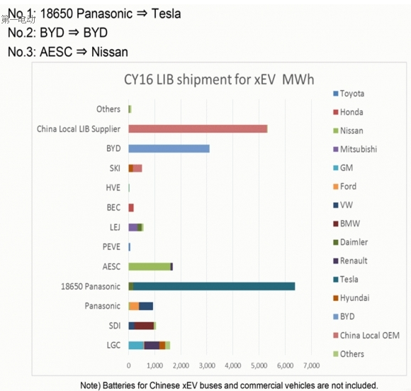 在乘用車領(lǐng)域,據(jù)B3公司統(tǒng)計(jì)的動(dòng)力電池出貨量數(shù)據(jù)顯示,2016年 ,松下排名第一,比亞迪排名第二,AESC排名第三。雖然LG化學(xué)在2016年沒能進(jìn)入前三甲,但是預(yù)測在2017年排名將會(huì)有將顯著上升(圖3)。