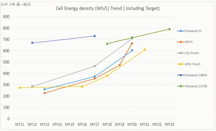為了能夠進(jìn)一步改進(jìn)電池性能,全球電池廠家的電池技術(shù)上的競爭也將進(jìn)一步加劇。例如,LG化學(xué)優(yōu)化改進(jìn)了很多電池設(shè)計(jì)細(xì)節(jié),以便電池能夠滿足通用汽車Volt和Bolt的要求,包括電池能量密度、耐久性和成本等上使用。圖4概括了電池Cell的能量密度(Wh/L)的發(fā)展趨勢(包括方形硬殼電池Pr,軟包電池Pouch、圓柱電池18650/21700),到2020年,動(dòng)力電池Cell能量密度將普遍超過600Wh/L。