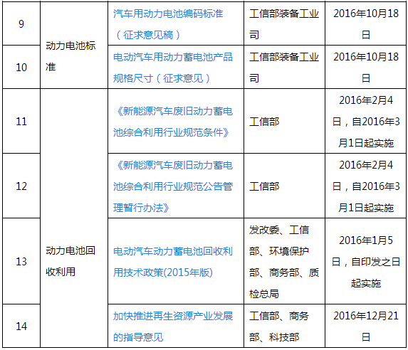 2016年1月5日,國家發(fā)展改革委、工信部、環(huán)保部、商務部、質(zhì)檢總局聯(lián)合印發(fā)《電動汽車動力蓄電池回收利用技術政策(2015年版)》,對電動汽車動力電池的設計生產(chǎn)、回收主體、梯次利用及再生利用等做出了具體規(guī)定。