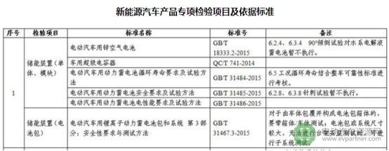 新規(guī)定要求的新能源汽車產(chǎn)品專項檢驗目錄中,與動力電池相關的檢驗項目如下: