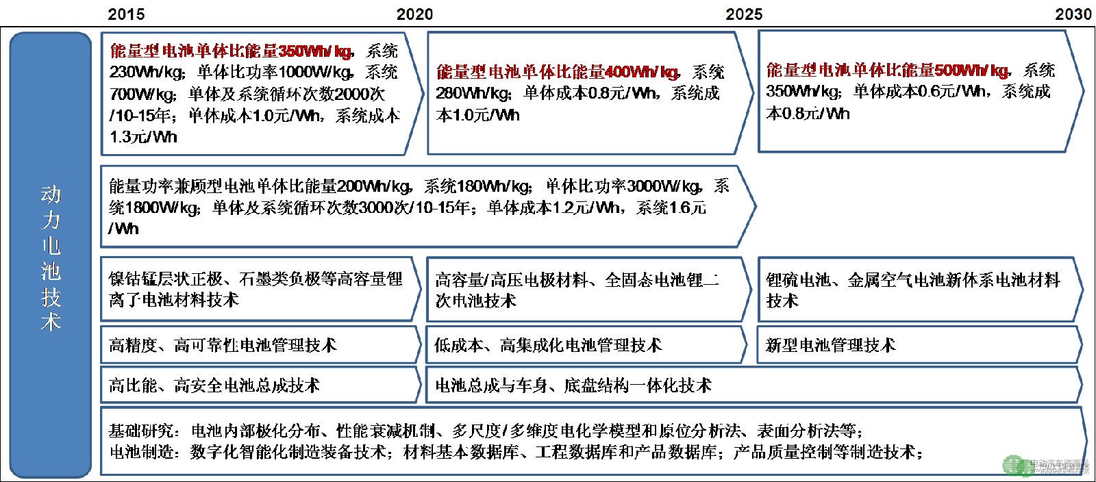 2016年10月26日,《節(jié)能與新能源汽車技術路線圖》發(fā)布,其主要內(nèi)容是“1+7”,即總體技術路線圖、節(jié)能汽車技術路線圖、純電動和插電式混合動力汽車技術路線圖、氫燃料電池汽車技術路線圖、智能網(wǎng)聯(lián)汽車技術路線圖、汽車制造技術路線圖、汽車動力電池技術路線圖、汽車輕量化技術路線圖。其中,動力電池技術路線圖為: