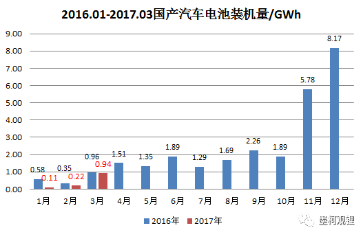 中國(guó)儲(chǔ)能網(wǎng)訊:2017年1季度國(guó)產(chǎn)電動(dòng)汽車(chē)的電池裝機(jī)量著實(shí)不多,只有127.4萬(wàn)kWh,同比下降了32.7%。大家現(xiàn)在一定很關(guān)心2017年全年的汽車(chē)電池裝機(jī)量會(huì)達(dá)到多少,這里,墨柯給出一些參考數(shù)據(jù),協(xié)助大家去判斷并做相關(guān)預(yù)測(cè)。