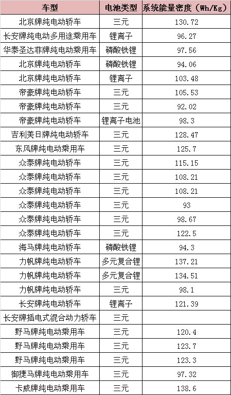 從系統(tǒng)能量密度來看,電池系統(tǒng)能量密度達120Wh/kg以上的純電動乘用車達11款,占新能源乘用車總數(shù)量的41%,可獲得1.1倍補貼,均為三元電池。另外3款磷酸鐵鋰均不超過100Wh/kg。