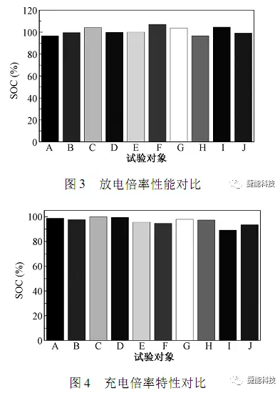 由圖3可以看出,磷酸鐵鋰和三元材料電池的倍率放電容量均在96.7%以上,其中B型50Ah方形硬殼磷酸鐵鋰電池以8C放電電流放電,放電容量是初始容量的99.6%按照GB/T31486的要求,動(dòng)力電池充放電倍率檢測(cè)只進(jìn)行一次倍率評(píng)價(jià),而高倍率循環(huán)對(duì)電池壽命的影響還需進(jìn)一步測(cè)試目前,GB/T標(biāo)準(zhǔn)未對(duì)倍率循環(huán)后的能量衰減做出要求,無法量化考核大電流沖擊對(duì)電池循環(huán)壽命的影響,這一點(diǎn)還有待完善圖4中磷酸鐵鋰和三元材料電池的充電倍率性能均高于國標(biāo)要求的初始能量的80%以上在選型的10個(gè)樣品中,磷酸鐵鋰電池的充電倍率特性要優(yōu)于三元材料電池鋰離子電池的充放電倍率特性決定了可以以多大的速度將能量存儲(chǔ)在電池里;或者以多大的速度將能量從電池中釋放出來倍率指標(biāo)是電池能否作為車用能源系統(tǒng)的關(guān)鍵鋰離子電池的充放電倍率性能,與鋰離子在正負(fù)極電解液以及它們?cè)诮缑娴倪w移能力和電池內(nèi)部散熱速率有關(guān)。因此,想要提高和改善充放電倍率特性,要從鋰離子遷移速率和散熱速率兩方面著手,主要方法有:(1)提高正負(fù)極鋰離子擴(kuò)散能力;(2)提高電解質(zhì)離子電導(dǎo)率;(3)降低電池內(nèi)阻;(4)電池內(nèi)部熱場(chǎng)均衡。