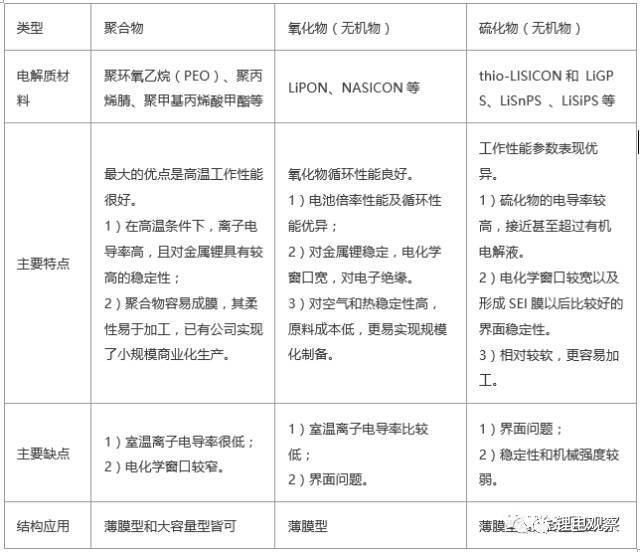 根據(jù)固態(tài)電解質(zhì)材料類別,可以分為聚合物全固態(tài)鋰電池和無機(jī)物全固態(tài)鋰電池,不同類型的電解質(zhì)其性能具有較大的差異(可見下表2),根據(jù)結(jié)構(gòu)設(shè)計(jì)的差別,全固態(tài)鋰電池又可分為薄膜型和大容量型。