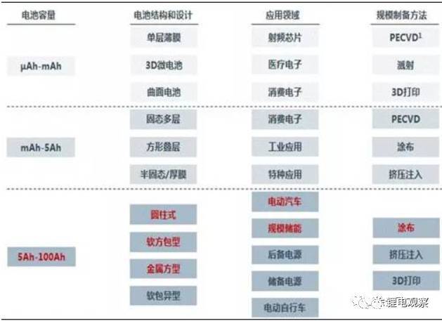 圖4:全固態(tài)鋰電池結(jié)構(gòu):薄膜型(左1和左2)和大容量型(右1)