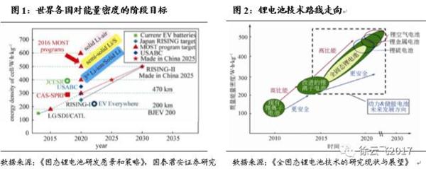 固態(tài)鋰電池有望成為下一代鋰電池發(fā)展的重要方向。世界各國(guó)先后制訂了高能量密度鋰電池的研發(fā)目標(biāo),日本政府率先提出“2020 年純電動(dòng)汽車用動(dòng)力電池電芯能量密度達(dá)到250Wh/kg,2030年達(dá)到 500Wh/kg”的目標(biāo)。2015年11月美國(guó)USABC將 2020年電芯能量密度目標(biāo)由原來(lái)的220Wh/kg 提高至350Wh/kg?!吨袊?guó)制造2025》確定的技術(shù)目標(biāo)是2020 年鋰電池能量密度到300Wh/kg,2025 年能量密度達(dá)到400Wh/kg,2030 年能量密度達(dá)到500Wh/kg。