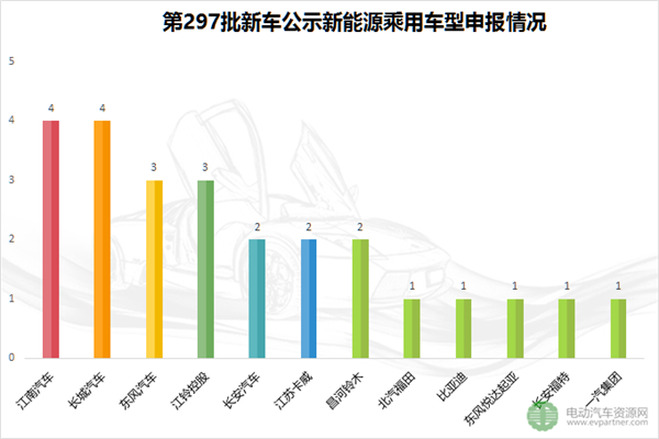 經(jīng)電動(dòng)汽車資源網(wǎng)統(tǒng)計(jì),第297批新車公示的25款新能源乘用車來自12家企業(yè),分別為:江南汽車(4)、長城汽車(4)、東風(fēng)汽車(3)、江鈴控股(3)、長安汽車(2)、江蘇卡威(2)、昌河鈴木(2)、北汽福田(1)、比亞迪(1)、東風(fēng)悅達(dá)起亞(1)、長安福特(1)、一汽集團(tuán)(1)。