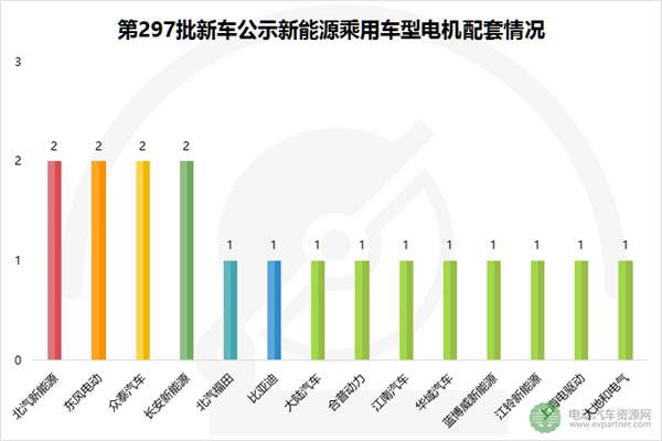 從配套的電機(jī)企業(yè)來看,據(jù)電動(dòng)汽車資源網(wǎng)統(tǒng)計(jì),第297批新車公示的25款新能源乘用車中有18款純電動(dòng)乘用車,這18款純電動(dòng)乘用車電機(jī)由14家電機(jī)企業(yè)提供配套,分別為:北汽新能源(2)、東風(fēng)電動(dòng)(2)、眾泰汽車(2)、長安新能源(2)、北汽福田(1)、比亞迪(1)、大陸汽車(1)、合普動(dòng)力(1)、江南汽車(1)、華域汽車(1)、藍(lán)博威新能源(1)、江鈴新能源(1)、上海電驅(qū)動(dòng)(1)、大地和電氣(1)。
