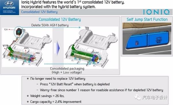 中國儲能網(wǎng)訊:現(xiàn)代搞了一個大噱頭,Ioniq混合動力變成世界上第一塊去掉12V傳統(tǒng)電池的汽車。HyundaiIoniq Ditched Its Traditional 12V Lead-Acid Starter Battery減重11.8kg容積提升2.4%。