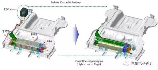 其實(shí)仔細(xì)查了一下,現(xiàn)代的工程師在混合動力電池里面把12V的AGM電池替換成鋰電池,然后通過整合放在了一起,做到了混合動力一體化的電池系統(tǒng)里面了。