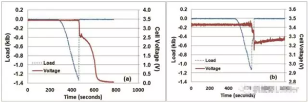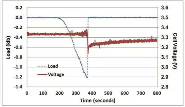 為了方便讀者理解本文,下圖是給出了LFP電池一個非常典型的成功通過機械擠壓測試(正反饋)的判據(jù),電池擠壓變形達到一定的程度后,引起了電池內(nèi)短路的發(fā)生,電池電壓迅速下降,檢測到電壓下降后(0.1V),擠壓力隨之被移除,電池的電壓快速回升,電池沒有發(fā)生熱失控,則電池通過擠壓實驗。
