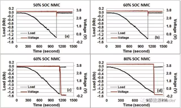 在對25Ah的NMC電池擠壓-扭轉(zhuǎn)測試中,發(fā)現(xiàn)50%SoC狀態(tài)下的電池都成功通過了測試,如圖a所示,60%SoC狀態(tài)下的電池有三只通過了測試,如圖b所示,另外的三只沒有通過測試,如圖c所示,可見60%SoC的電池通過測試和不通過測試的概率各為50%,而80%SoC的電池則都沒有通過測試,如圖d所示。由此可見,60%SoC是NMC電池安全性的一個分水嶺,低于這個數(shù)值時電池相對是安全的,高于這個數(shù)值,則電池在機械濫用的情況下的安全性將大大下降。