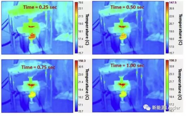 下圖為60%SoC的NMC電池在擠壓-扭轉(zhuǎn)實驗中的熱成像圖,從圖中可以看到在短路發(fā)生后,短路點的溫度在0.5S內(nèi)迅速升高到了147.5 ℃,隨后高溫區(qū)域迅速向周圍擴展,說明周圍區(qū)域溫度升高并不是由熱傳導導致的,而是高溫引發(fā)了其他的化學反應。而在80%SoC下,NMC電池發(fā)生熱失控的溫度更高,引起周圍化學反應的速度也更快。
